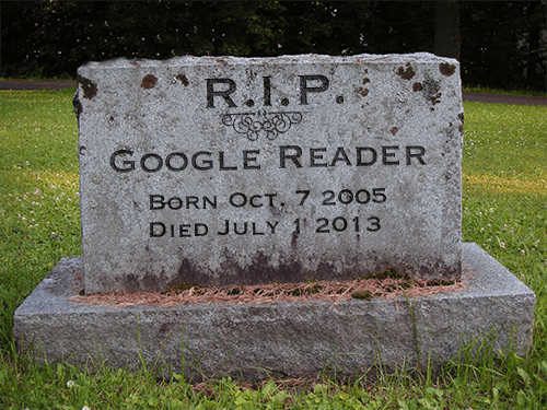 Google Reader (sometimes referred to simply as “Reader”) was laid to rest on Monday, July 1, 2013. It was seven years, eight months, and 24 days old at the time of its death. Reader, a happy resident of Mountain View, CA, was declared to have a terminal illness on March 13, 2013. Despite heroic efforts by its users to bring it back from the brink of the grave, Reader was taken off life support on July 1.