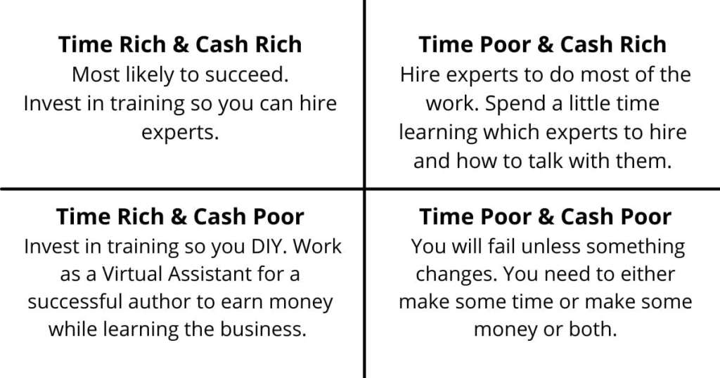 Some authors have more time, and some have more cash. Your time-cash surplus (or lack of a surplus) will determine which strategy you’ll use.
